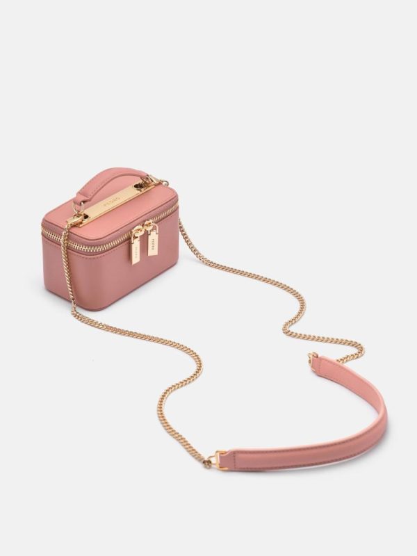 This Leather Mini Vanity Case in blush is the epitome of functionalism meets style. Designed for the modern woman, the bag comes with gold hardware and a leather top handle, as well as a detachable chain link strap, which proffers the wearer multiple styling options. The embossed cow leather and microfiber finishing adds a final touch of elegance to your whole ensemble.