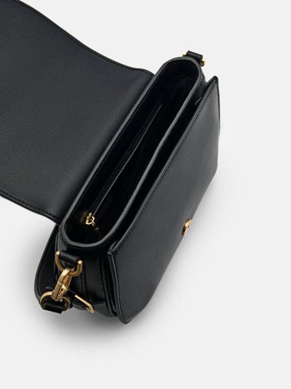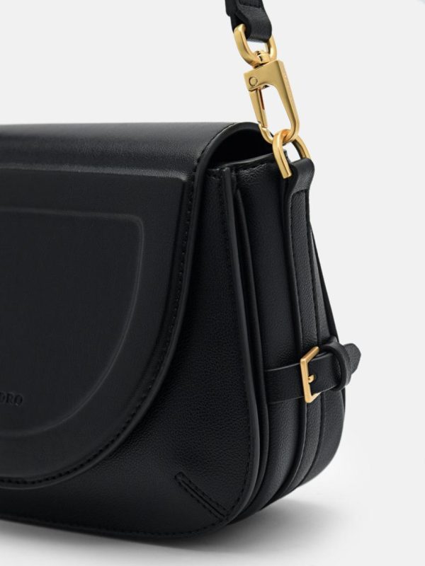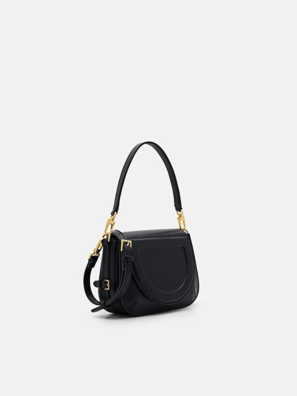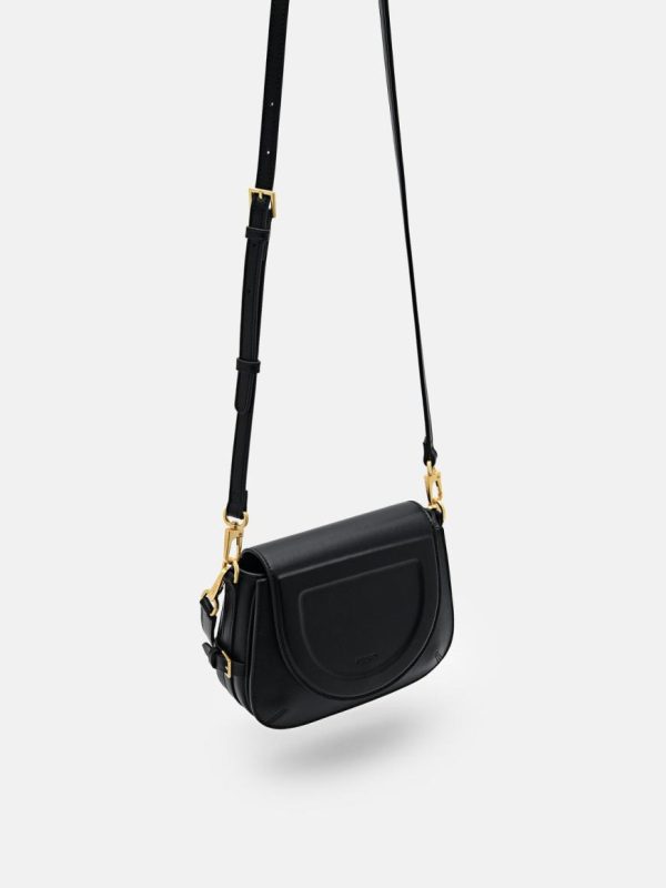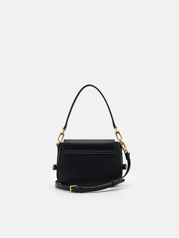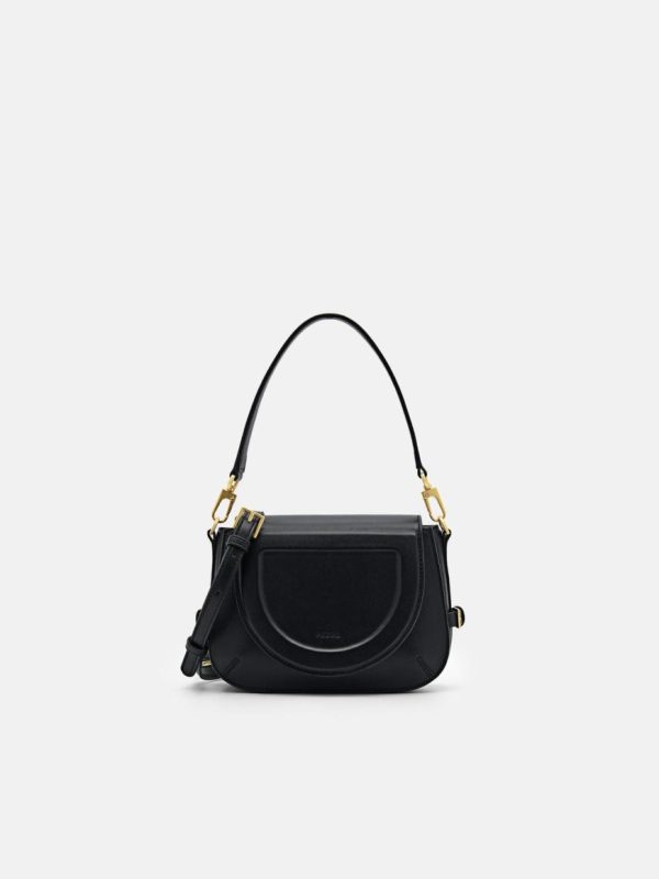 Structured lines meet a gracefully rounded silhouette with the Edita Mini Shoulder Bag in black. Crafted to perfection, its distinctive D-shaped moulding and subtle gold-toned hardware exude understated elegance and modernity. The magnetic closure ensures seamless access to essentials, while the removable shoulder sling offers versatility in styling. Complete with a removable shoulder sling for versatile styling.