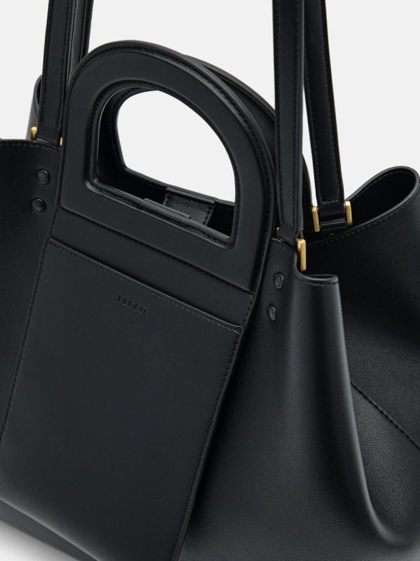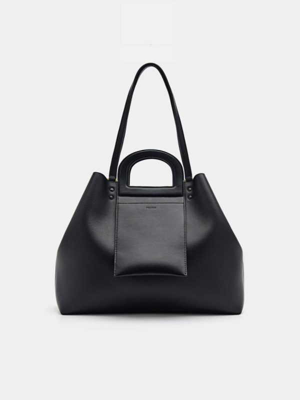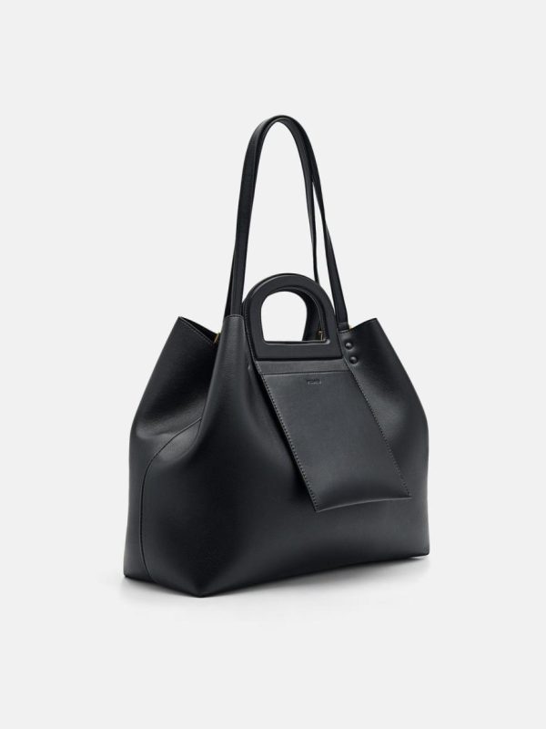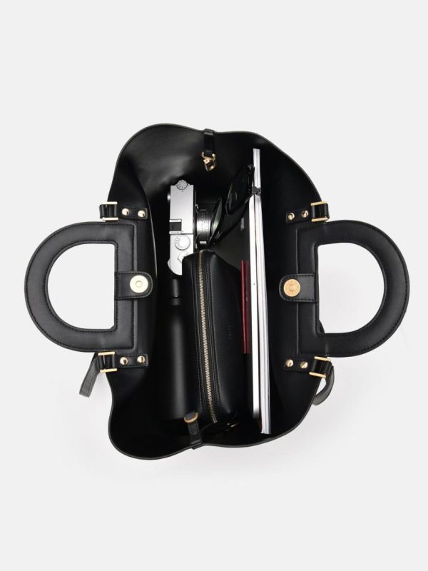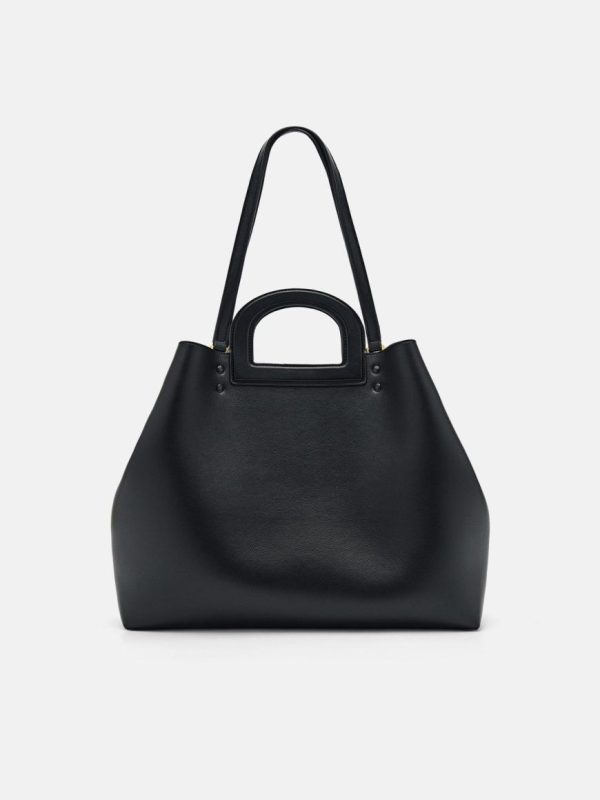 Discover practical sophistication with the Edita Tote Bag in black, designed for effortless elegance and functionality. Crafted in an extra-large size, it offers ample space for all your essentials and more. The distinctive D-shaped handle adds a modern touch. Secured with a discreet magnetic closure, this tote includes an additional removable pouch for enhanced organization.
