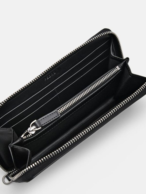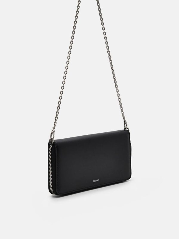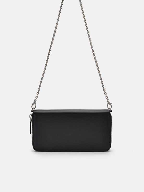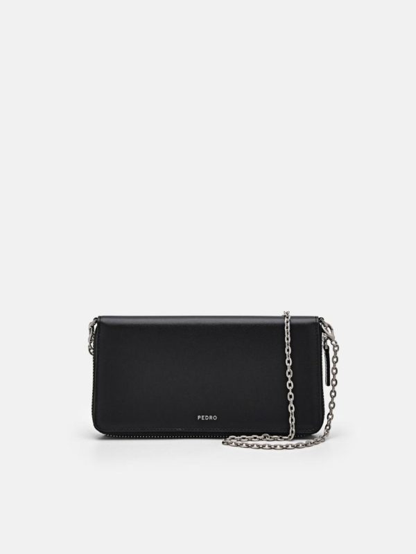 Secured with a smooth zipper closure, ensure your essentials are impeccably organized and protected with this Leather Chain Wallet in black. Crafted from calf leather, this long wallet exemplifies understated elegance and impeccable craftsmanship. Its clean, minimalist design is adorned with discreet hardware branding, embodying a sense of effortless luxury. The chainlink detail adds a sophisticated touch, offering both visual allure and practical versatility for crossbody wear or as a sleek clutch.