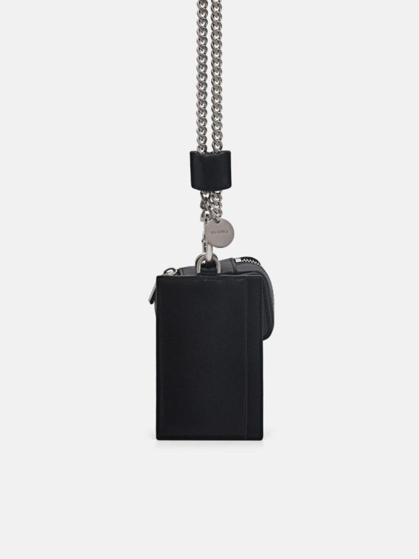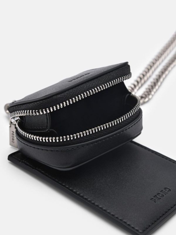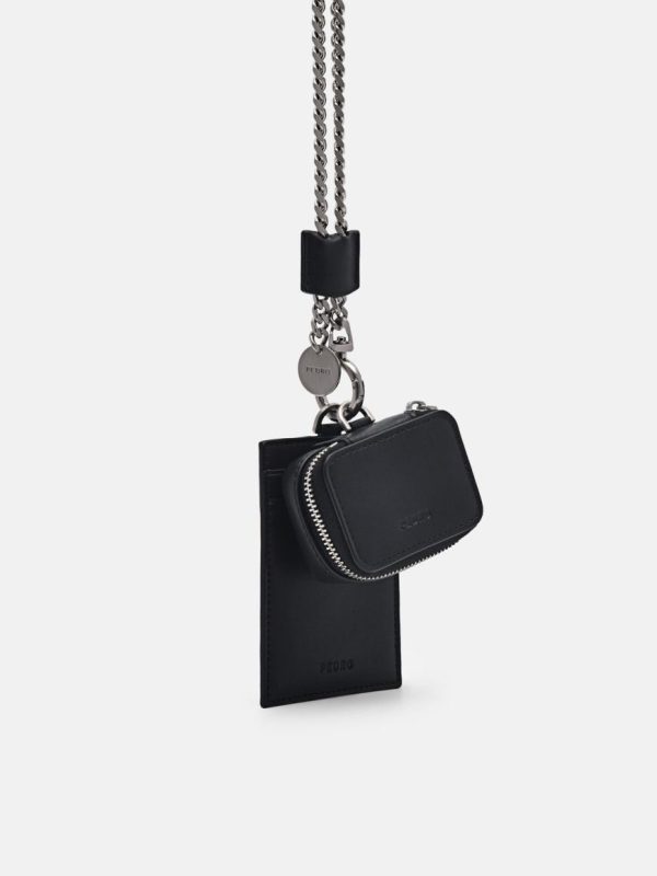 Elevate your daily essentials with this sophisticated black leather lanyard featuring a convenient card holder. This modern statement piece combines practical functionality with stylish design, featuring a detachable pouch for versatile carrying options. The sleek chainlink strap with its decorative accent adds a fashionable touch that complements any outfit.