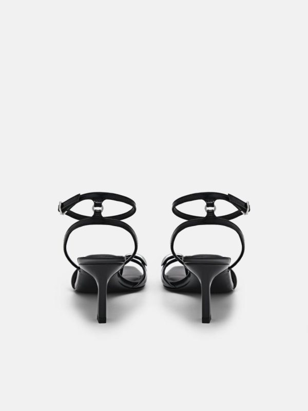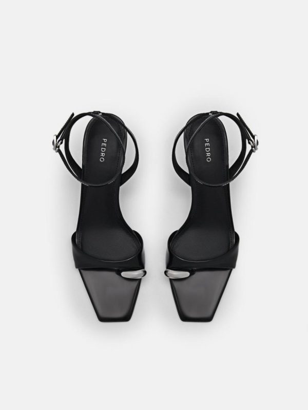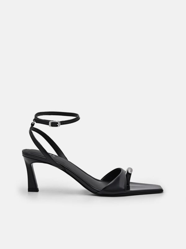 Sleek and stylish, strut your stuff with the Lia Heel Sandals in black. Fashioned with a sleek silhouette for feminine elegance with a youthful twist and an ankle closure for a secure fit, toe ring hardware embellishment adds a playful yet refined touch for the woman with a penchant for artistic flair.