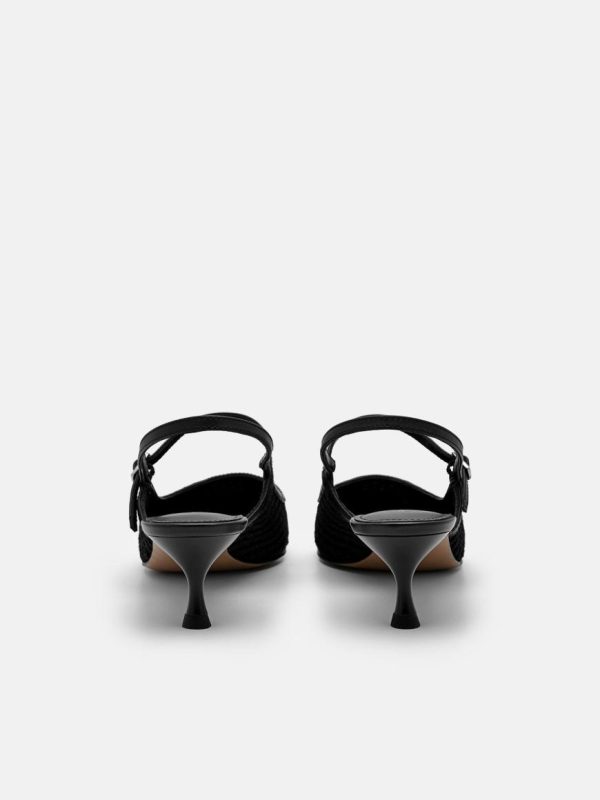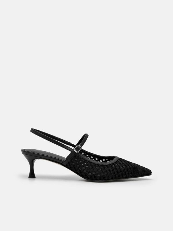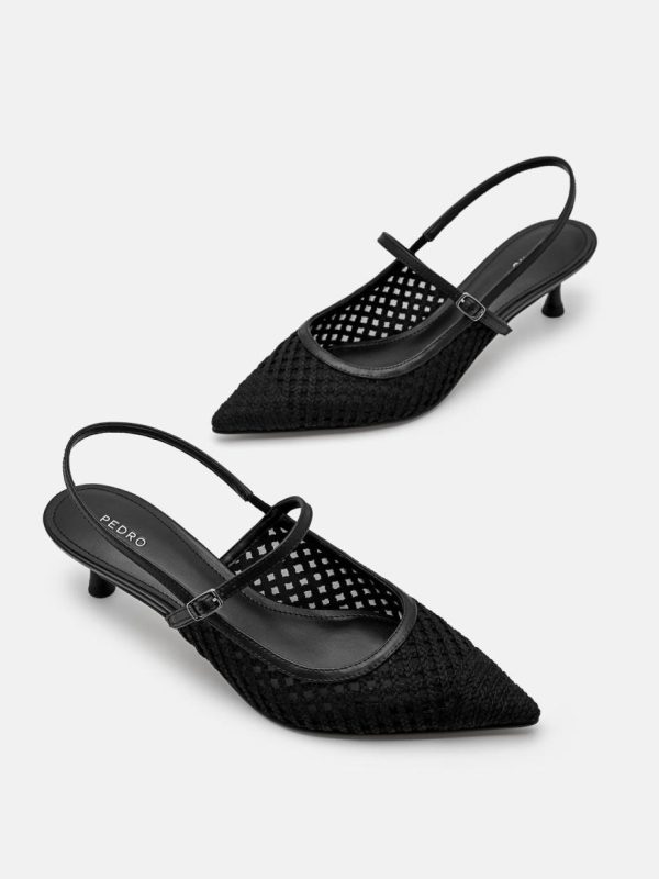 Elevate your style with the sophisticated Marvel Heel Pumps in classic black. The intricately woven upper combines straw and mesh for a contemporary textured look, while the elegant pointed toe delivers timeless appeal. Experience perfect comfort and support with the sleek slingback design, complemented by a versatile kitten heel that provides just the right amount of lift for all-day wear.