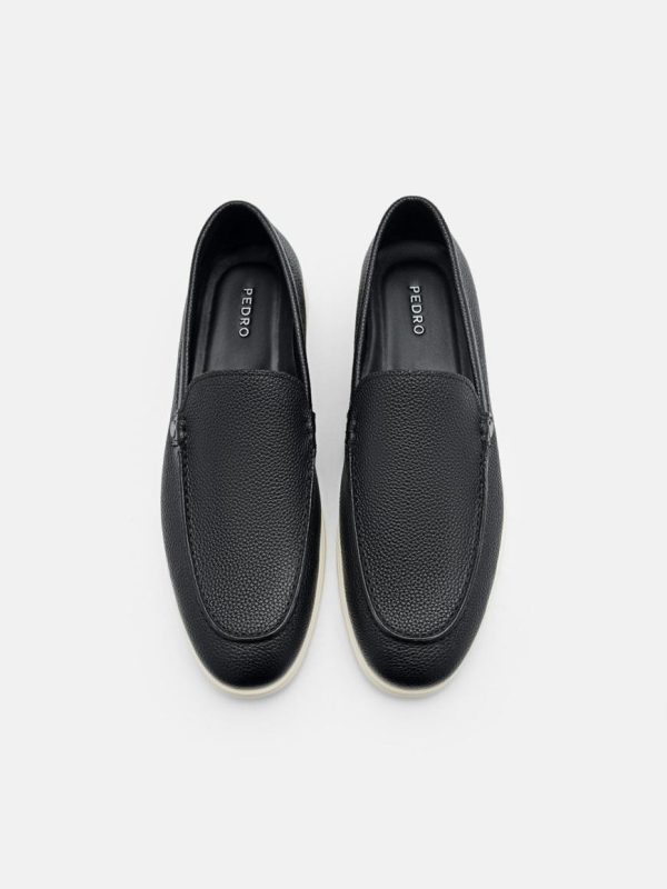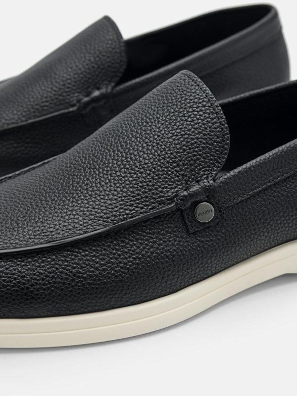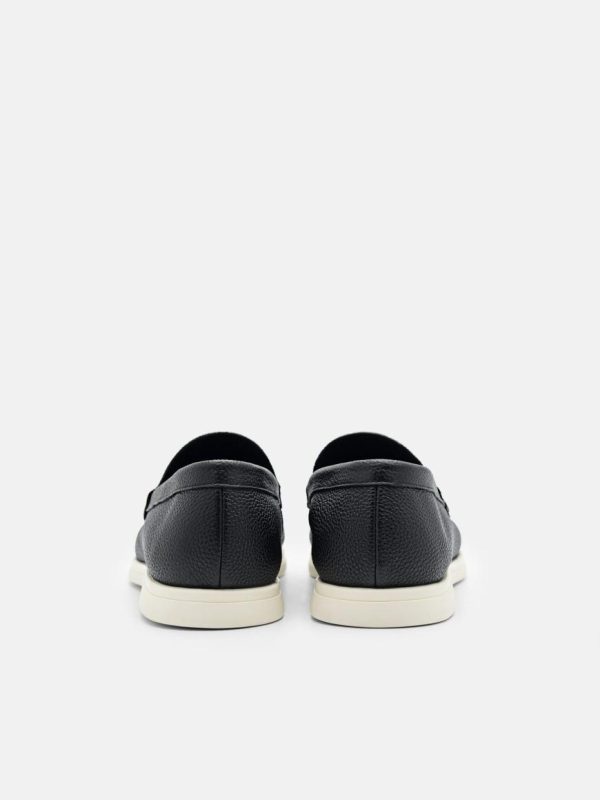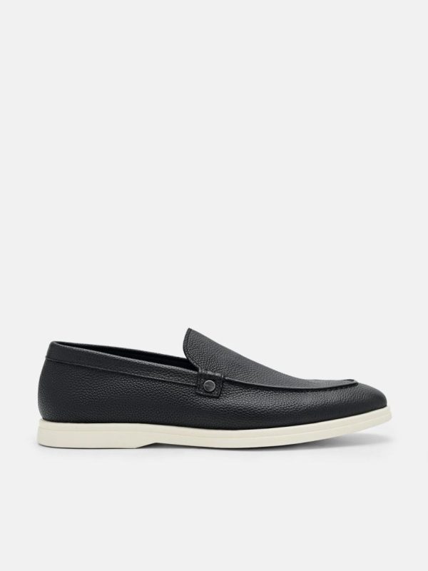 Elevate your everyday style with the Oliver Leather Loafers in sophisticated black. These premium loafers deliver exceptional comfort and timeless appeal, perfect for both casual outings and smart-casual occasions. Crafted with meticulous attention to detail, the embossed calf leather upper offers a refined texture that only gets better with wear. The classic moc-toe stitching and sleek silhouette create a versatile footwear option that effortlessly complements your wardrobe.
