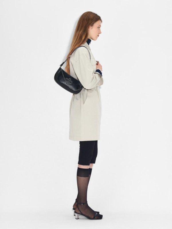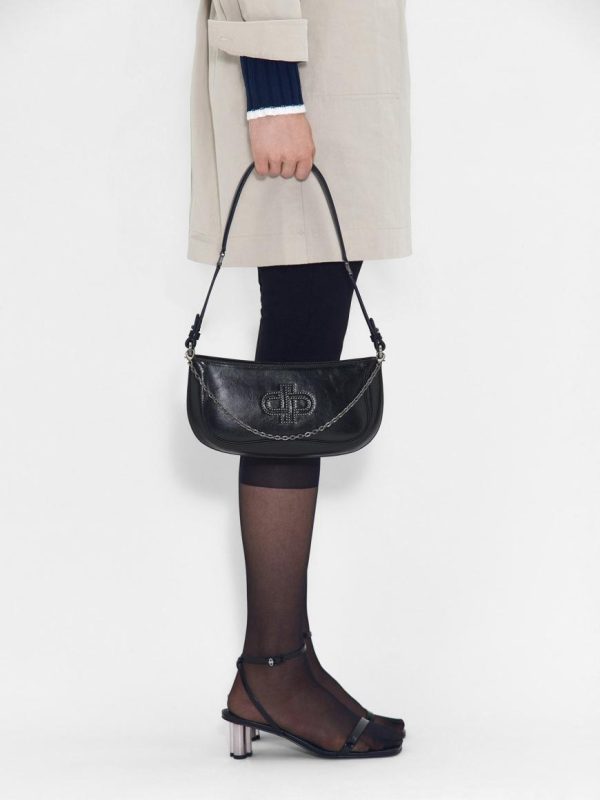 A sophisticated choice that effortlessly elevates any ensemble, the PEDRO Icon Oiled Leather Studded Shoulder Bag in black epitomizes modern luxury with its refined oiled calf leather and glossy texture. Crafted to perfection, its sleek silhouette and fluid lines exude understated elegance, accentuated by a studded monogram and chainlink embellishment for a touch of sophistication. Featuring a zipper closure for practicality and security, this versatile bag combines timeless style with functional design.