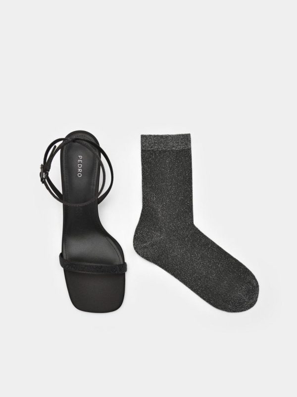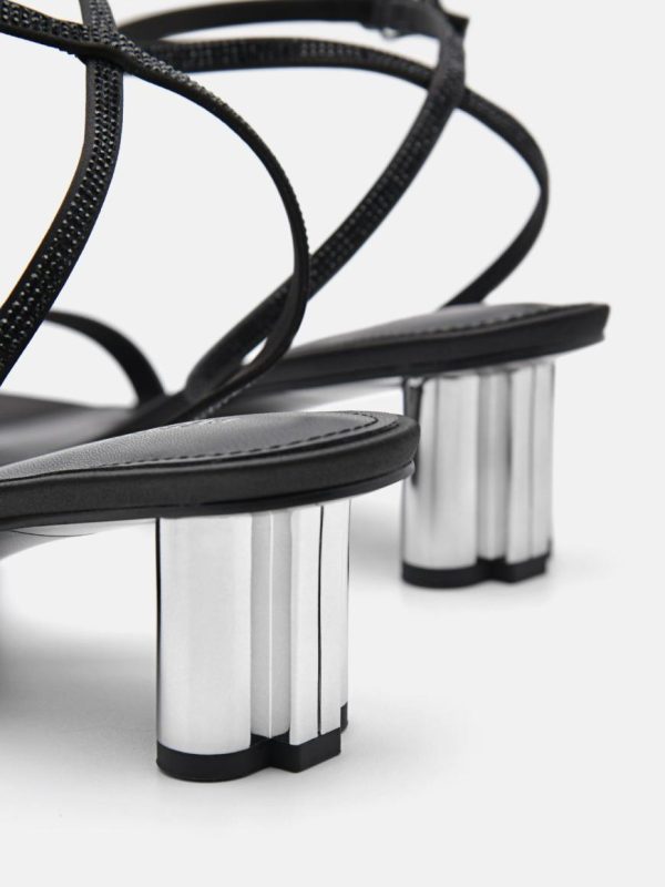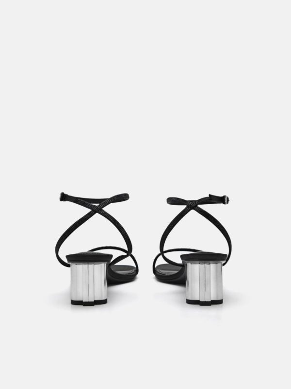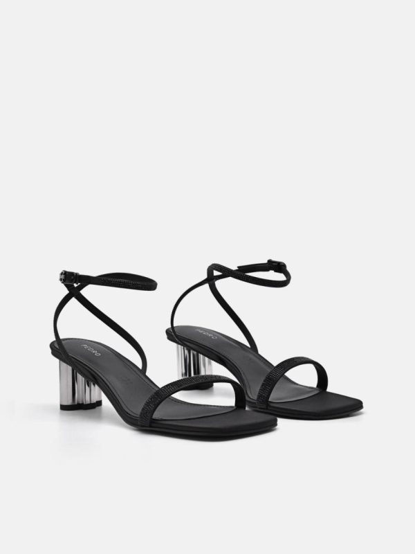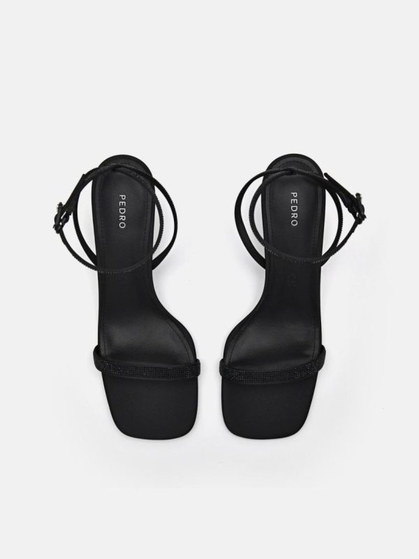 Meet the PEDRO Icon Satin Heel Sandals in sophisticated black, designed to elevate your style with contemporary elegance. These stunning sandals feature a sleek thin-strap design with a squared toe that creates a modern, fashion-forward profile. The standout detail is the brilliant silver heel meticulously crafted into the brand’s signature monogram, delivering a luxurious statement piece. An adjustable ankle closure ensures a perfect, secure fit while providing all-day comfort. Perfect for special occasions or adding a touch of glamour to your everyday wardrobe.