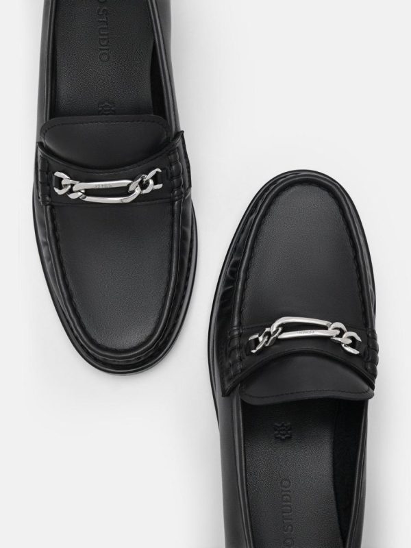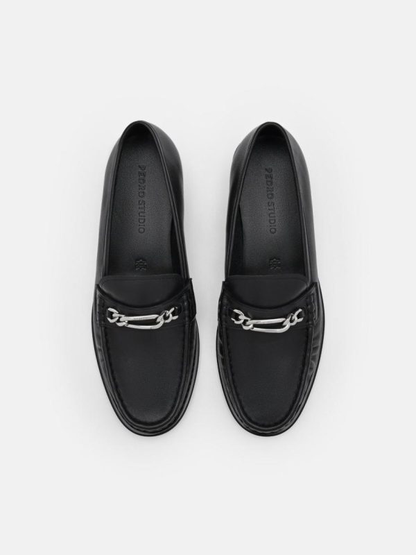Elevate your footwear collection with the PEDRO Studio Jeanne Leather Loafers in black. These loafers feature meticulous moc-style stitching, embodying the perfect fusion of tradition and innovation. The slip-on silhouette offers effortless ease, ideal for both office attire and off-duty elegance. Highlighted by high-shine hardware across the penny strap, these loafers exude understated class and refinement. Pair them with tailored trousers for a polished look, or style with cropped jeans for a casual weekend ensemble.