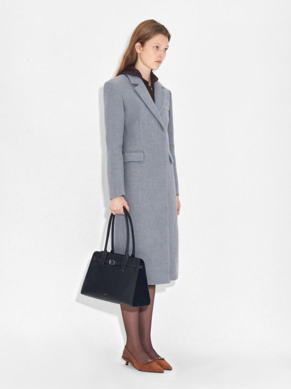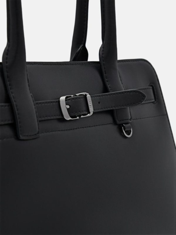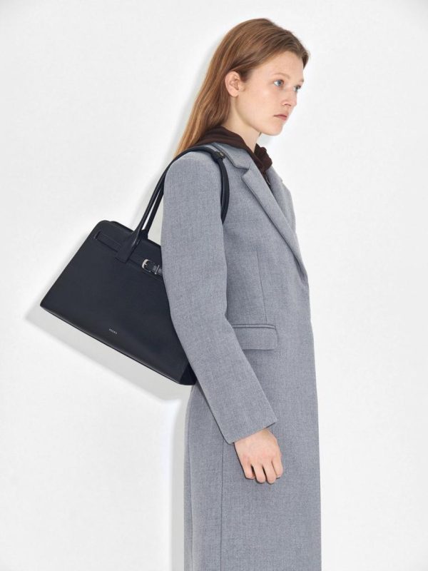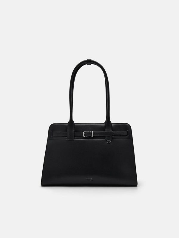 Elevate your professional ensemble with the PEDRO Studio Phoebe Leather Tote Bag in black, distinguished by its unique trapezoid shape and crafted from exquisite calf leather. Designed with a work-coded aesthetic in mind, this tote embodies both functionality and sophistication. The double handles offer comfortable carrying options, while sleek hardware details including a prominent buckle and subtle branding add a touch of refinement.