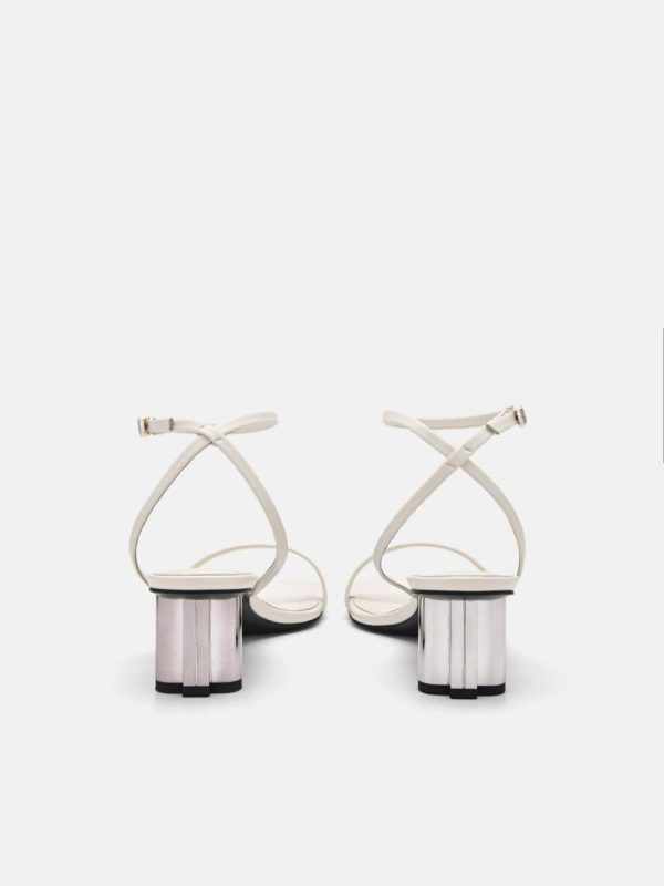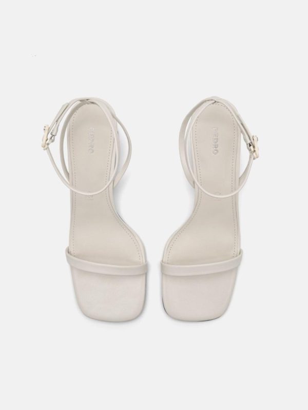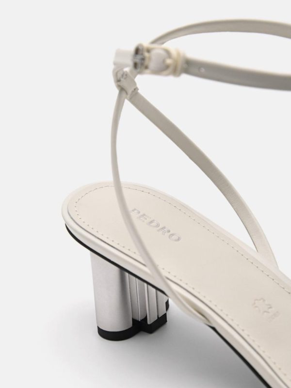 Introducing the PEDRO Icon Leather Heel Sandals in chalk, a fusion of individualistic style and timeless elegance. Crafted from supple calf leather, they feature a sleek, thin strappy upper and a squared toe, creating a modern and sophisticated silhouette. The highlight is the high-shine silver heel meticulously shaped into the brand’s iconic monogram, adding a distinctive touch. With an ankle closure ensuring a secure fit, these sandals effortlessly blend luxury and comfort, making them a standout choice for the cosmopolitan wardrobe.