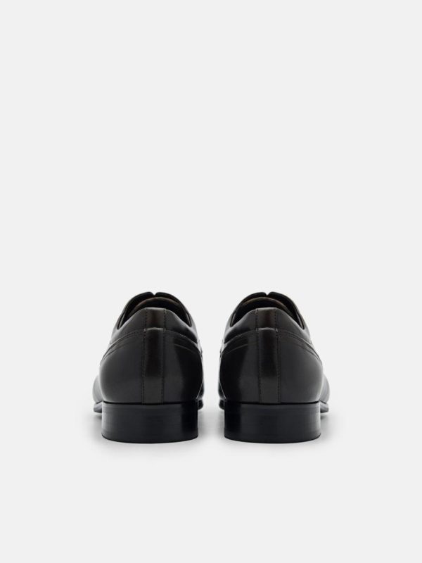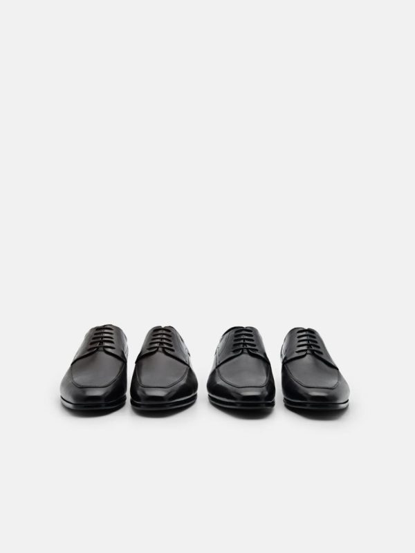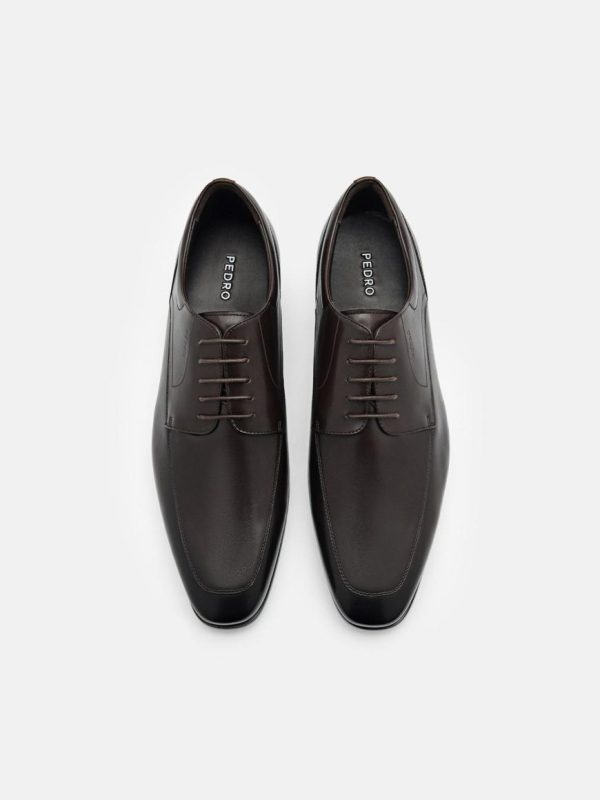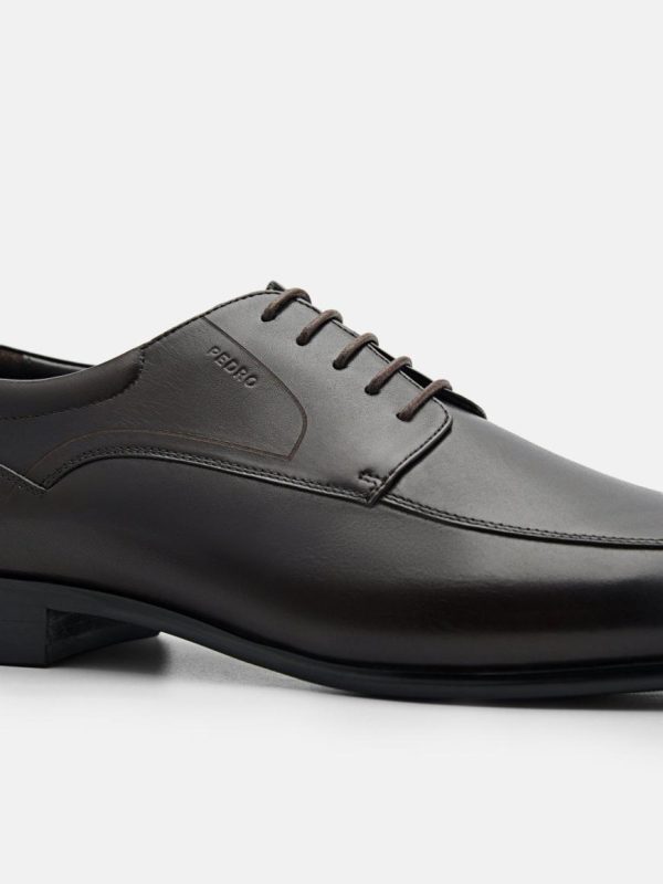 Inspired by understated elegance, indulge in refined simplicity with these Leather Derby Shoes in dark brown. Perfect for the modern professional, luxurious burnished calf leather feature clean lines and minimalist design for a stylish statement in any professional or formal setting. A lace-up closure and pointed square toe add a touch of timeless charm, while ensuring a comfortable and secure fit.