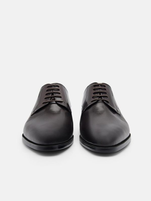 Rock a classic design that will pair with any outfit and add a tailored touch to your ensemble with these Leather Derby Shoes in dark brown. Giving a suave vibe with the classic derby cut, the lace-up displays a smooth burnished calf leather upper for lasting wear and is finished with a clean pointed toe design for a sleek profile.