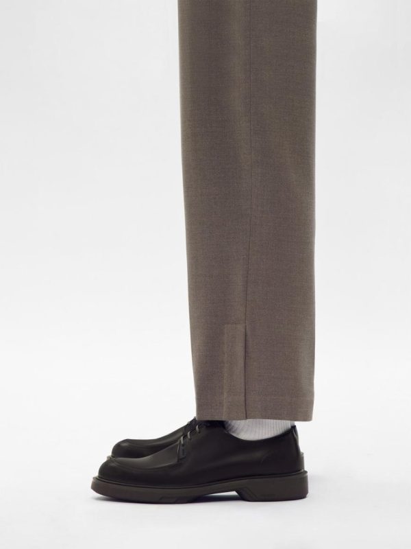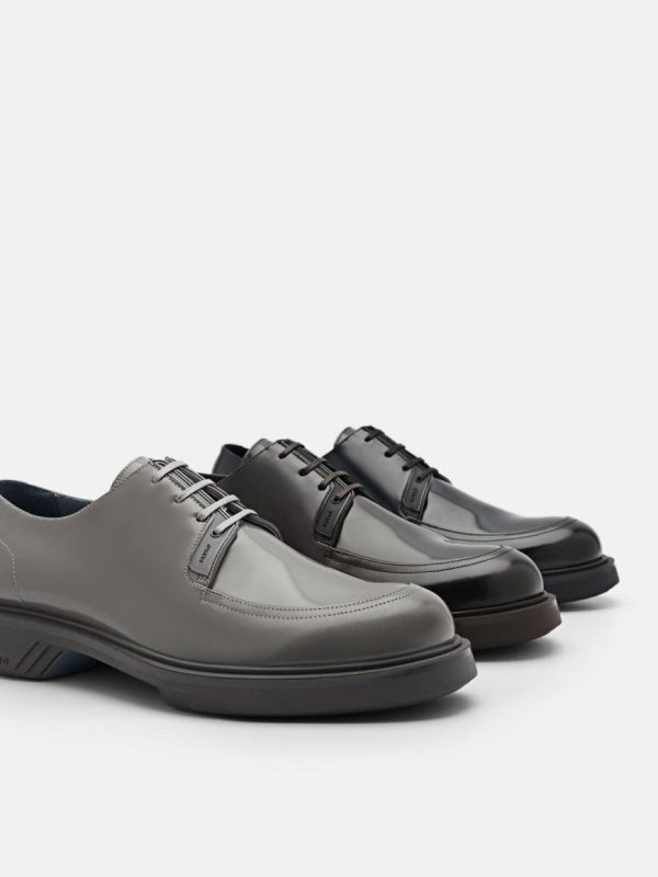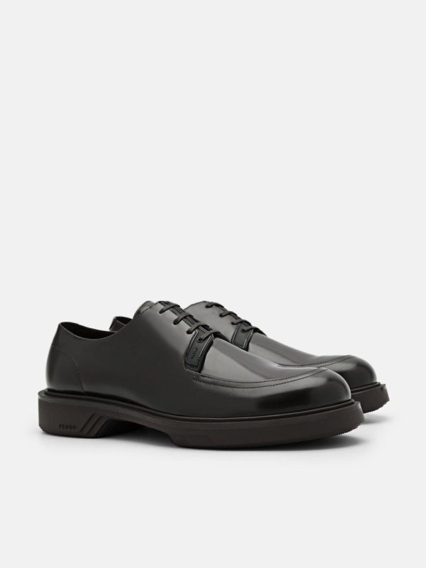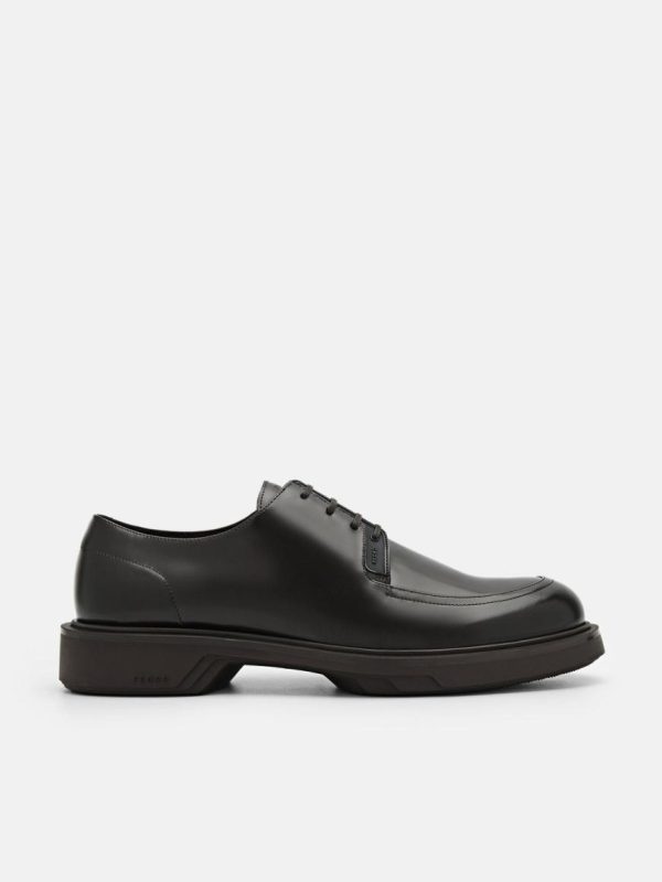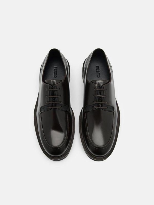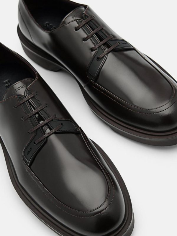 Defined by the modern and chunky outsole, make a mark and get going in the aesthetic and streamlined look of the Loop Leather Derby Shoes in dark brown. Sporting a glossy boxed calf leather for high-shine impact, contrasting rubber accents bring a utilitarian flair to a classic silhouette for a creative take on contemporary dressing.