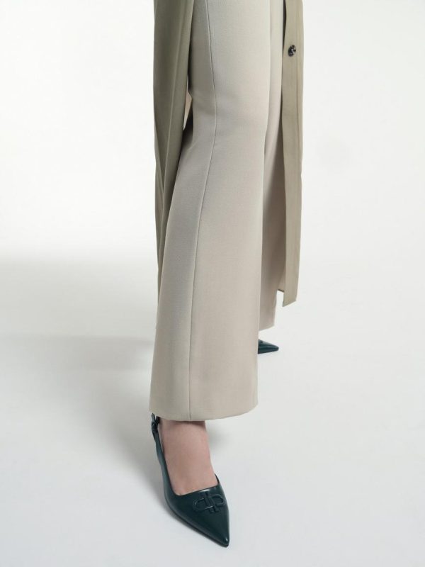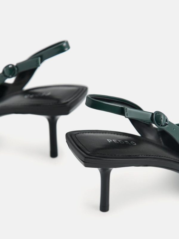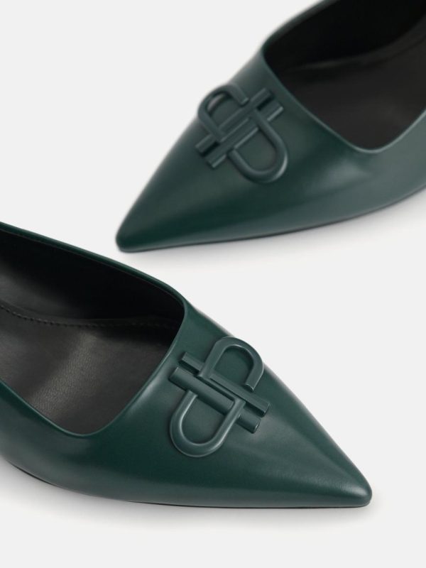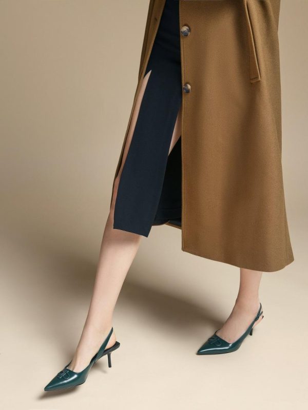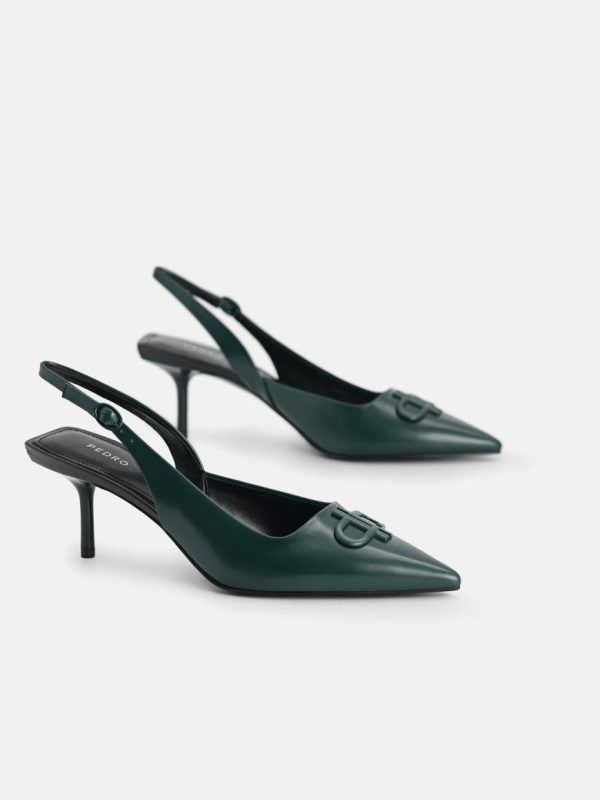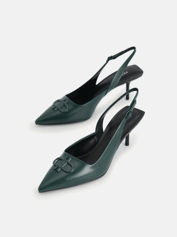 Elevate your style with these sophisticated dark green boxed calf leather heels featuring signature logo detailing. The adjustable slingback strap ensures a secure, comfortable fit while the sleek pointed toe delivers timeless elegance perfect for both professional settings and evening occasions.