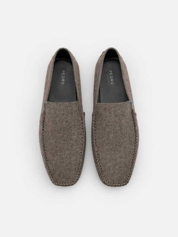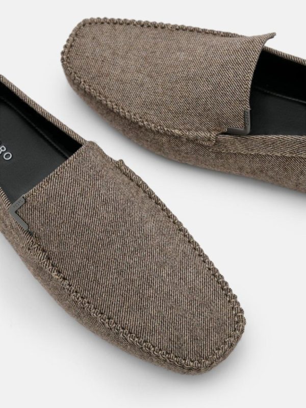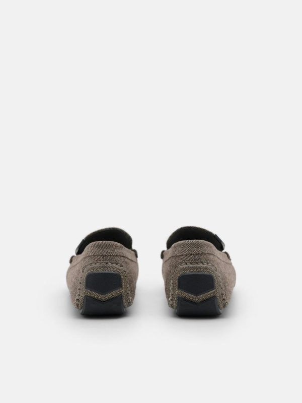 The Fabric Driving Shoes in taupe exude an air of sophistication with their impeccable fabric construction that guarantees a plush fit. The graphite appearance and subtle metallic embellishment add a subtle touch of opulence, whilst the sculptural elements of the shoe make for a striking visual statement. Slip into these Driving Shoes effortlessly with their slip-on design, and revel in the comfort of the square toebox.