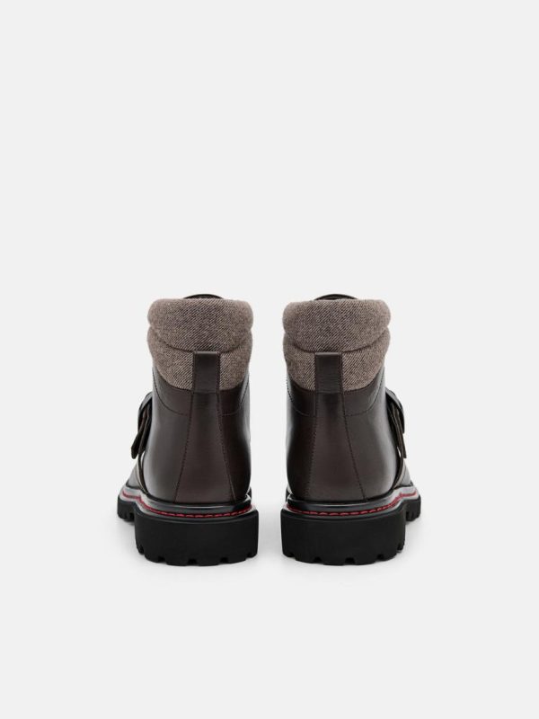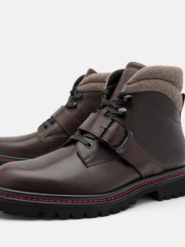Experience timeless style with a modern twist in these Helix Leather Boots featuring a rich dark brown finish. Crafted from premium burnished calf leather, these boots deliver exceptional durability and a sophisticated look that elevates any outfit. The combination of traditional lacing with a secure strap ensures a customized, comfortable fit that lasts all day. Our distinctive Helix buckle adds a bold statement piece to your footwear collection, while the contrasting sole stitching provides a sharp, eye-catching detail that sets these boots apart.