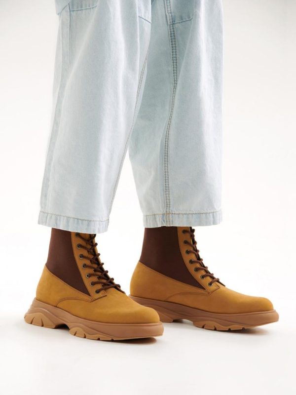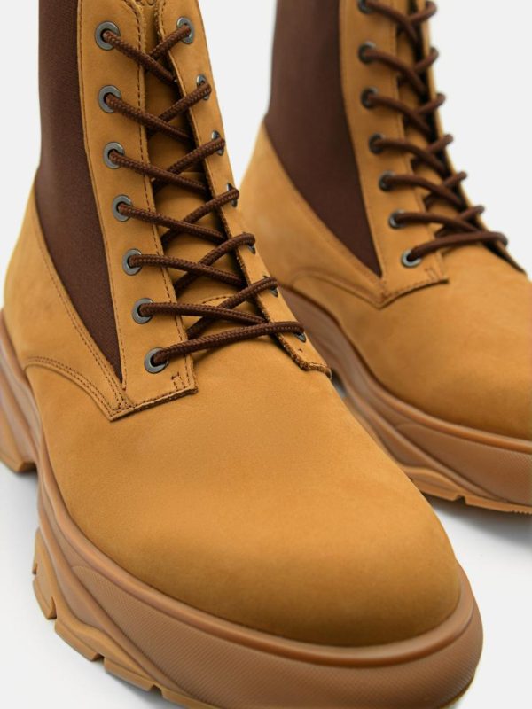 Experience the perfect fusion of contrasting materials with the Hybrix Leather Lace-Up Boots. The premium leather upper and flexible elastic band create a sleek silhouette, while the sneaker-inspired sole delivers modern comfort and street-ready style. These versatile boots transition effortlessly from casual to dressy occasions, providing a contemporary finishing touch to any outfit.