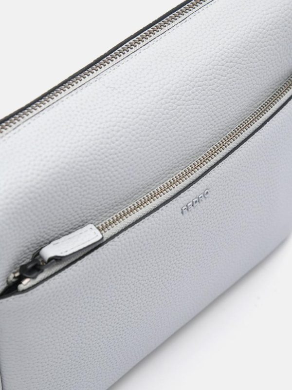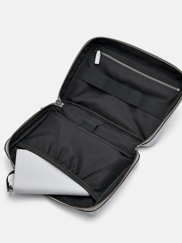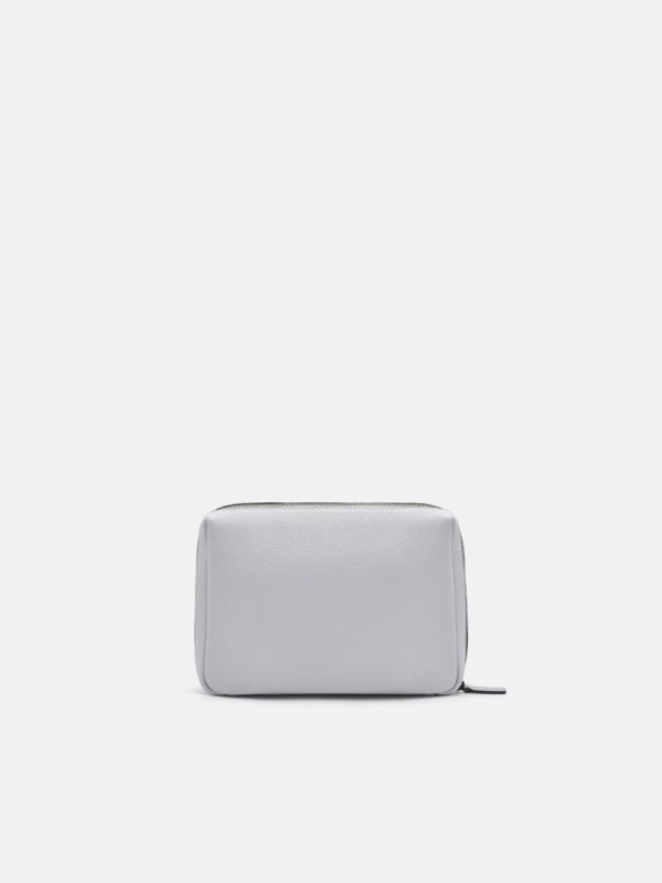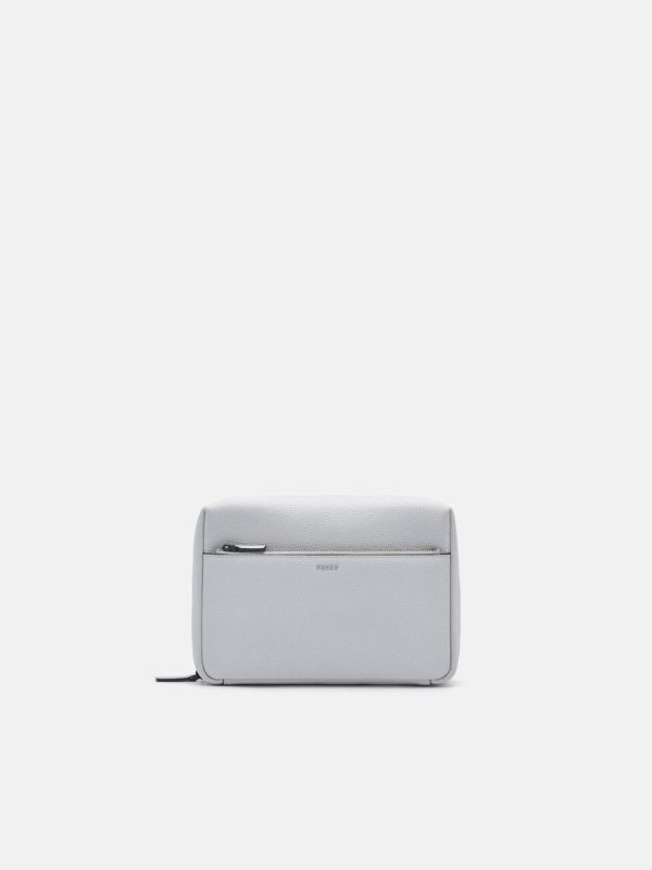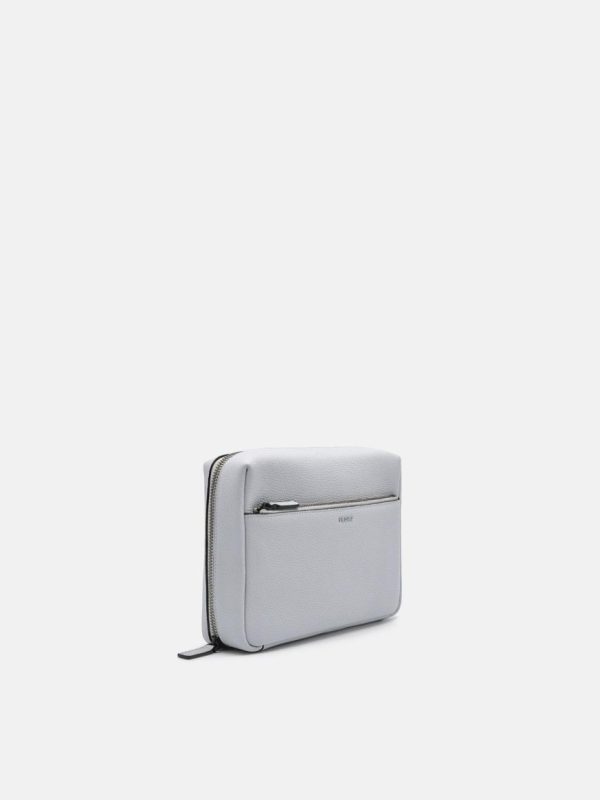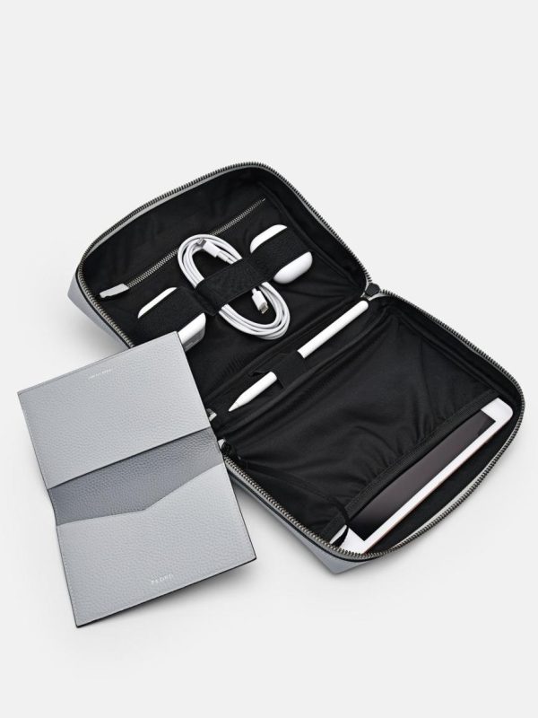 Elevate your travel essentials with the Embossed Leather Pouch in light grey. Crafted from embossed calf leather, the pouch features multiple compartments for meticulous organization and ample space to accommodate an 8′ iPad mini. Also included is a passport holder in a similar tone.