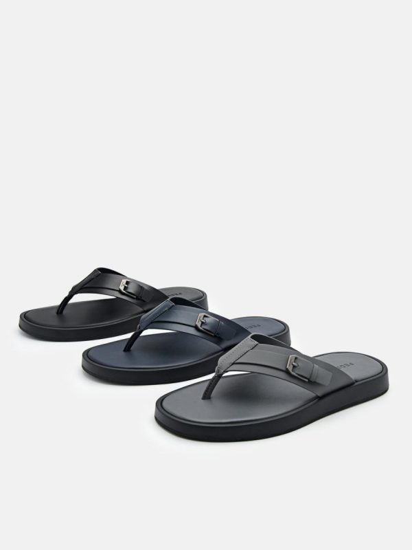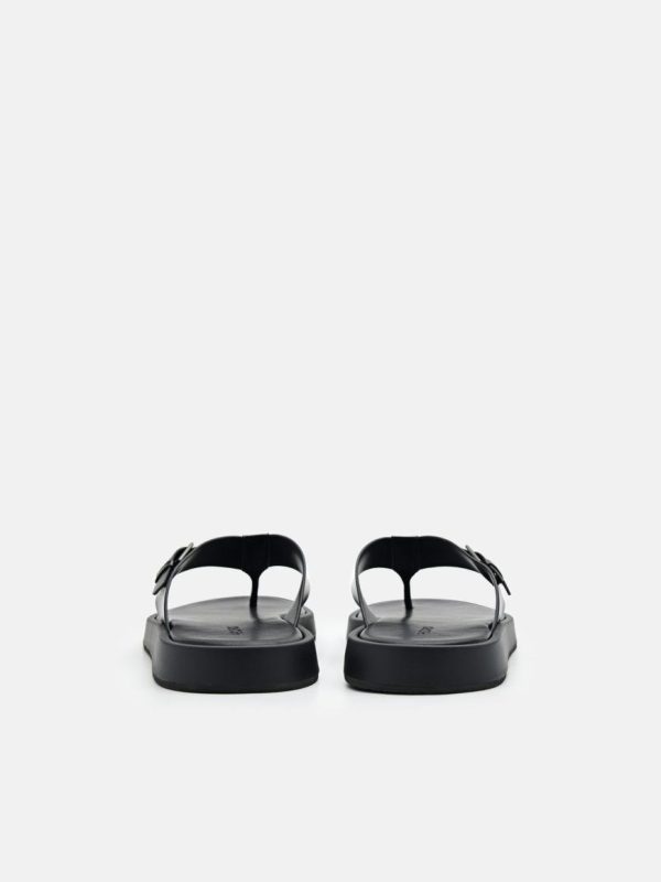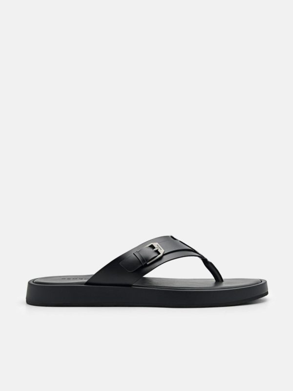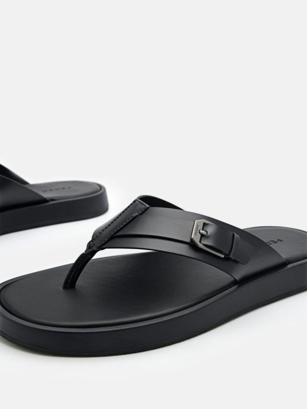 Experience the perfect fusion of minimalist style and all-day comfort with our sleek black buckle thong sandals. Designed for the modern man, these sandals feature reinforced toepost construction that stands up to daily wear while maintaining their polished appearance. The streamlined silhouette enhances your foot’s natural shape, complemented by a sophisticated metallic buckle with discreet branding for that perfect finishing touch.