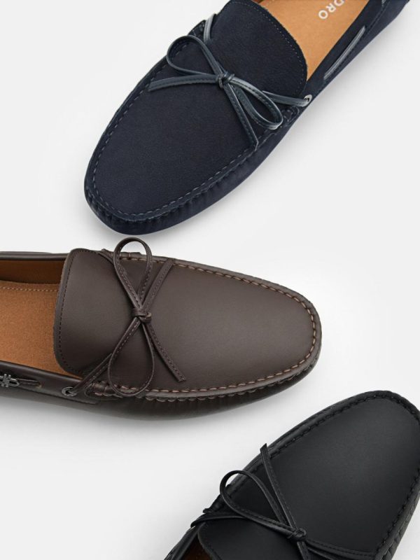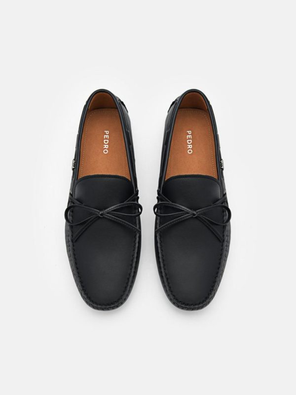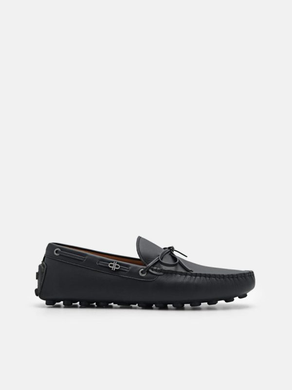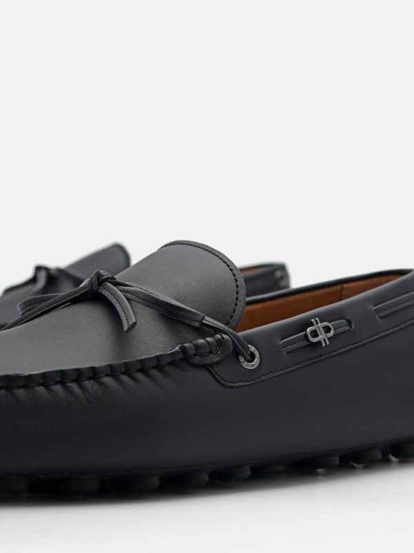 Elevate your casual wardrobe with these sophisticated black leather driving shoes featuring elegant bow detailing. Crafted from premium calf leather, these slip-on shoes deliver both style and comfort for the modern man on the go. The sleek design transitions effortlessly from day to evening, while the pebbled outsole ensures reliable traction with every step. Perfect for pairing with chinos, tailored trousers, or your favorite jeans for a polished yet relaxed look.