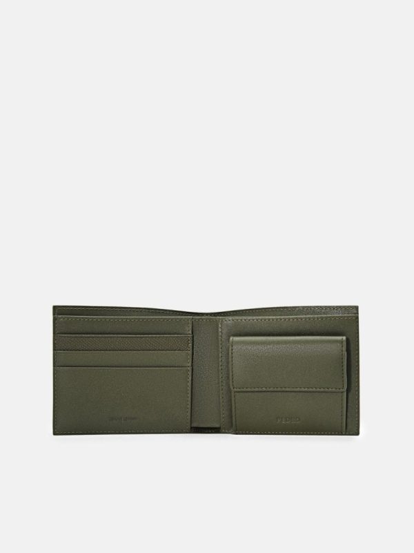Designed to elevate your everyday carry with understated style, the Leather Bi-Fold Wallet with Coin Pouch in military green features fabric accents for a tactile and multi-textured feel. Its bi-fold design features dedicated slots for cards and cash, ensuring efficient organization. A practical coin pouch adds convenience for loose change, enhancing its functionality. The cohesive tone-on-tone colour scheme underscores its sleek and minimalist aesthetic, making it a versatile accessory for any occasion.