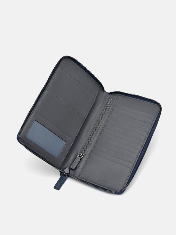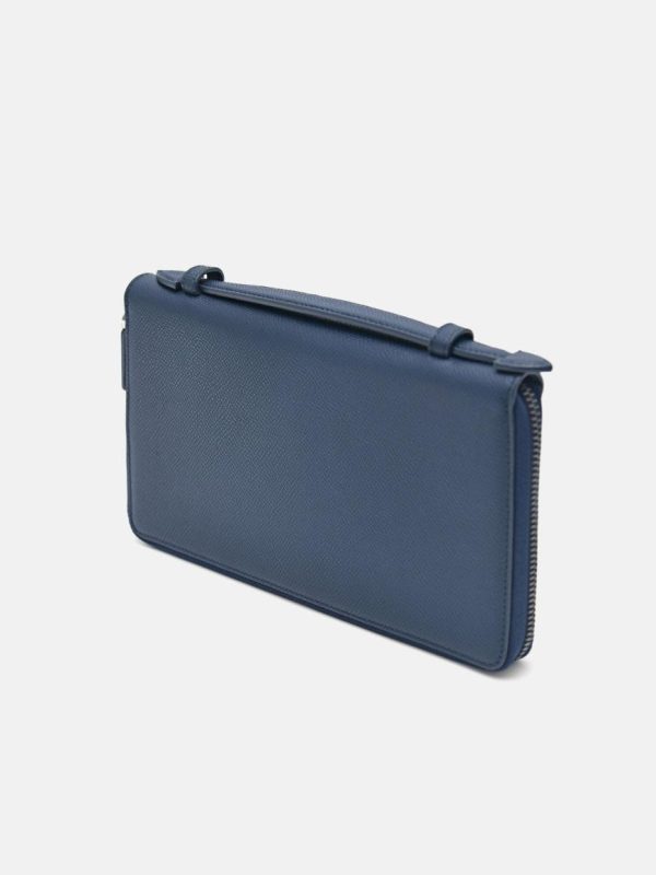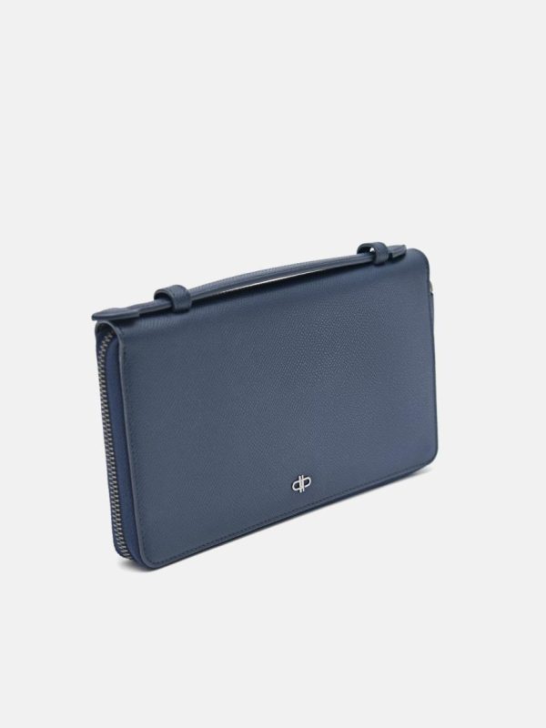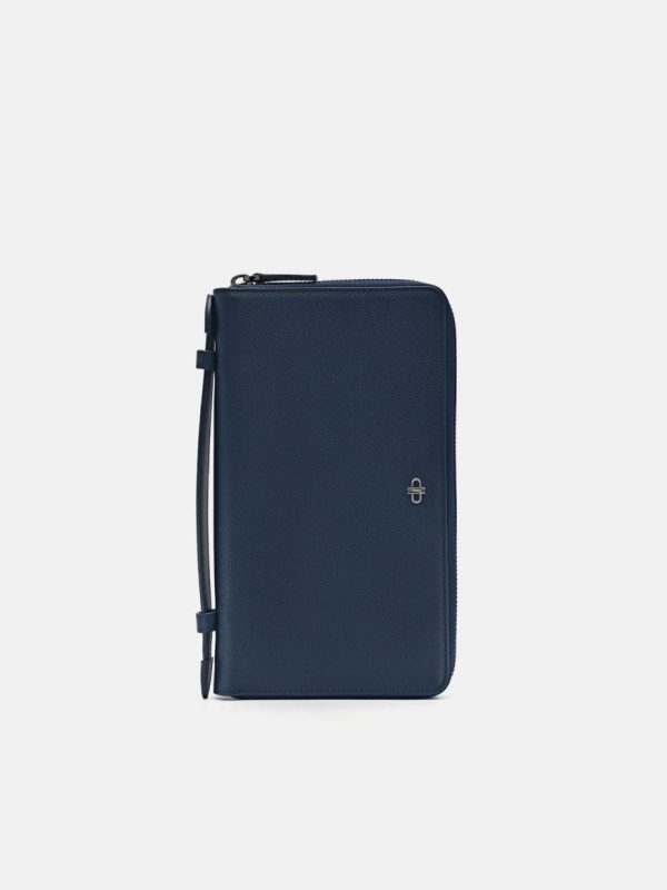 One does not require a bag with this Navy Leather Wallet Organisers; it has all the compartments you need for your daily essentials. Featuring a top handle, various pockets, and a spacious interior for your phone, this highly functional piece is designed in luxurious embossed calf leather and adorned with our in-house Pedro motif.