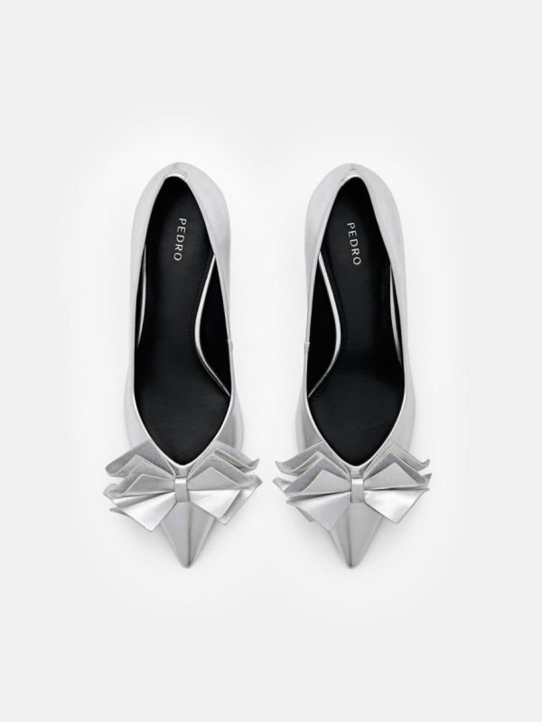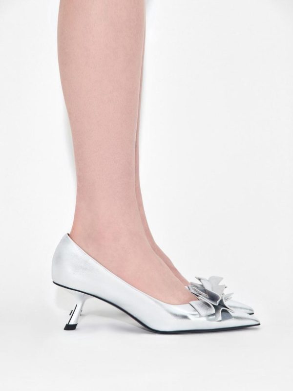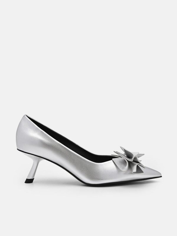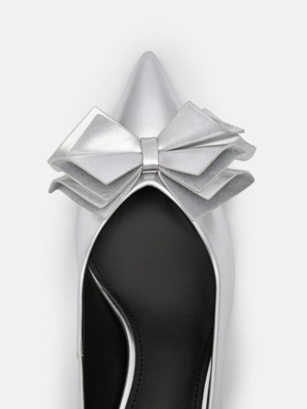 Make a stunning entrance with our captivating Stella Heel Pumps in radiant silver. Featuring an eye-catching 3D bow accent that commands attention, these pumps deliver sophisticated style with every step. The sleek silhouette and elegant comma heel create a graceful lift, while the pointed toe design adds a touch of refined glamour. Perfect for elevating your evening wardrobe and creating unforgettable moments.