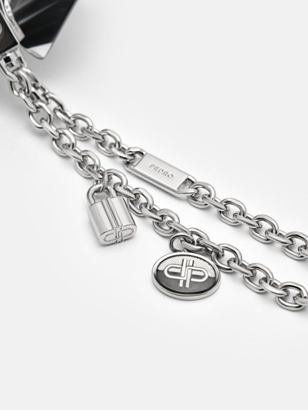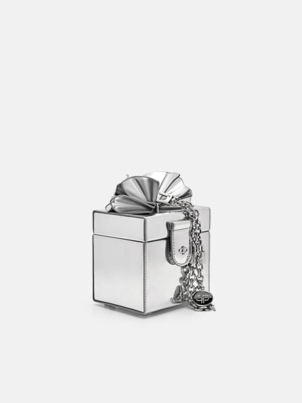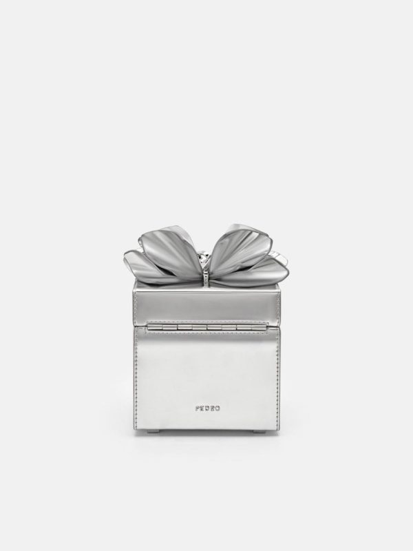 Elevate your accessory collection with the Stella Mini Clutch Bag in silver, epitomizing modern sophistication and practicality. Crafted in a structured, hard-cased design, it not only radiates elegance but also provides generous storage for your beauty essentials. Adorned with a refined silver chainlink handle featuring a discreet monogram charm and a textured oversized bow, this clutch effortlessly blends timeless charm with contemporary allure.