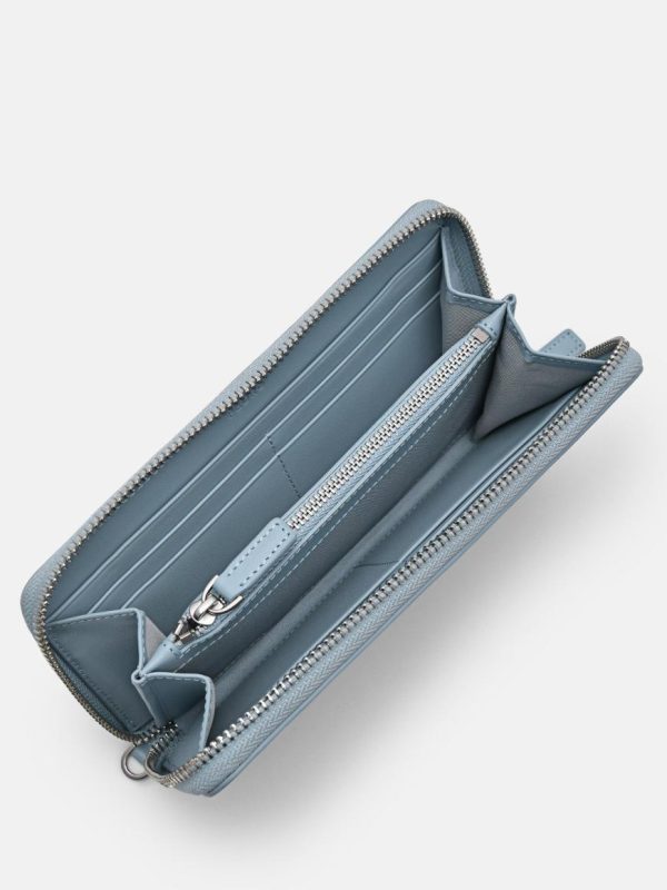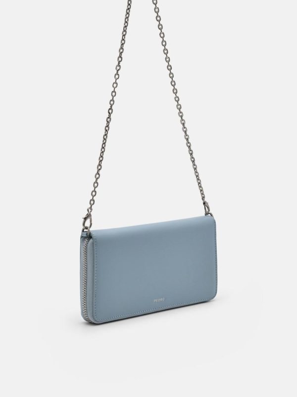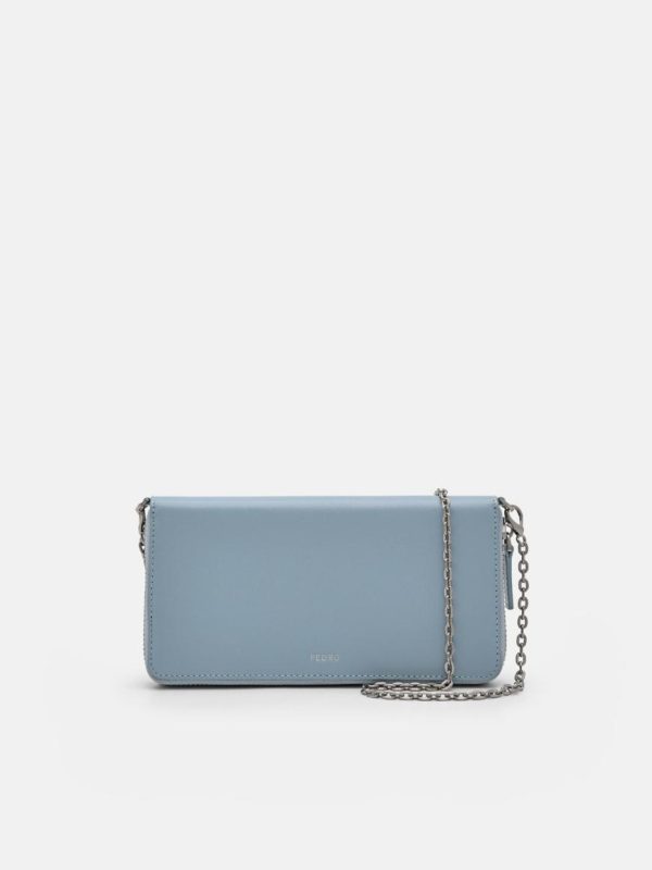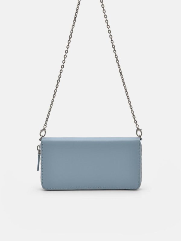 Secured with a smooth zipper closure, ensure your essentials are impeccably organized and protected with this Leather Chain Wallet in slate blue. Crafted from calf leather, this long wallet exemplifies understated elegance and impeccable craftsmanship. Its clean, minimalist design is adorned with discreet hardware branding, embodying a sense of effortless luxury. The chainlink detail adds a sophisticated touch, offering both visual allure and practical versatility for crossbody wear or as a sleek clutch.