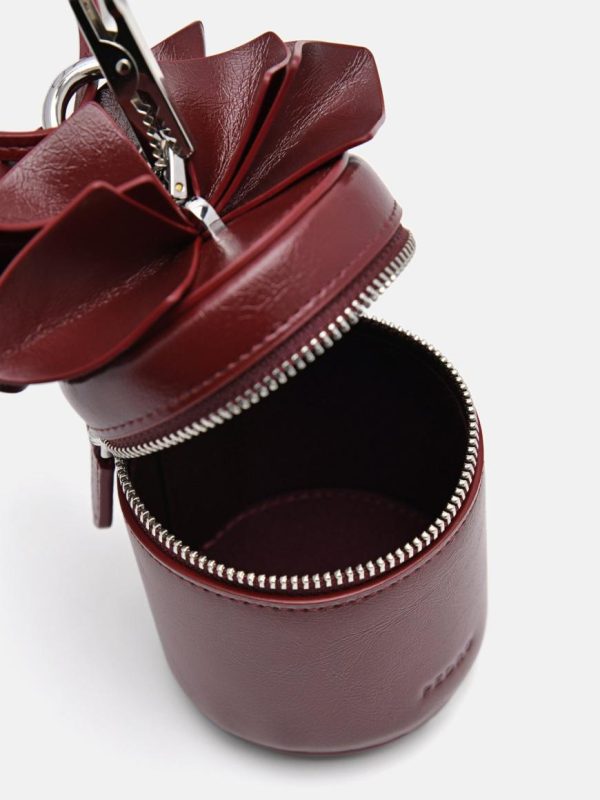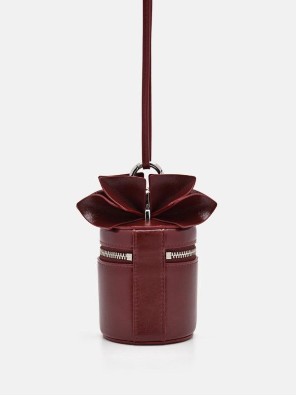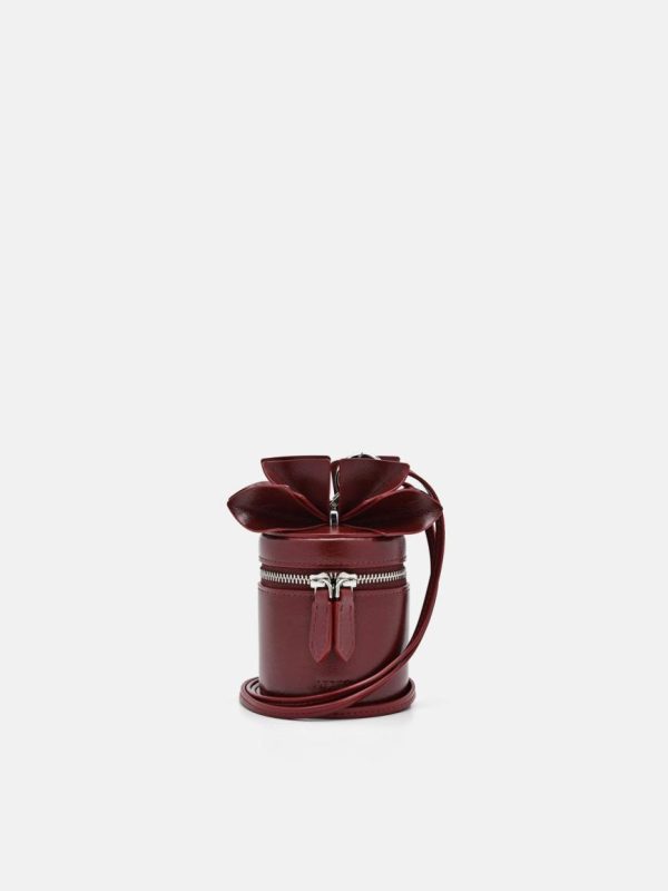 Coming in a compact design, the Micro Barrel Pouch in wine is perfect for carrying just the essentials with an air of sophistication. Accompanied by a sleek sling, its silhouette is complemented by a secure zip-around closure and an intricate three-dimensional bow detail that exudes timeless charm.
